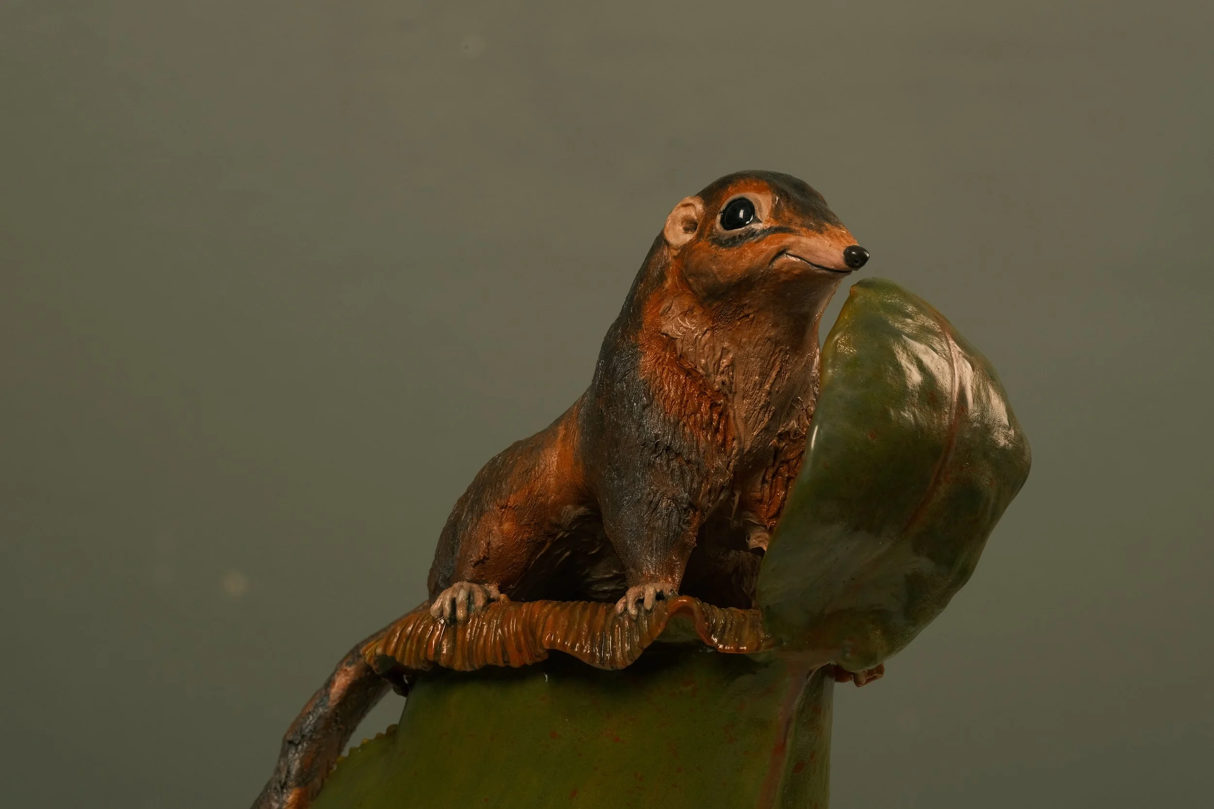 A treeshrew is answering a call of nature on a pitcher plant, while viewer shattering this moment of tranquility, the courteous treeshrew puts on an awkward but polite smile.